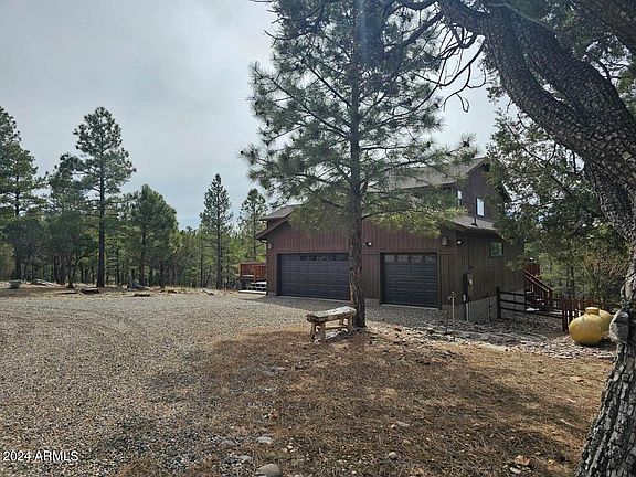 Welcome to your dream retreat in Happy Jack, Arizona, where this stunning property offers the perfect blend of luxury and natural beauty. Situated on 1.77 acres of lush land that borders the greenbelt, this fully remodeled home boasts 4 bedrooms, 3 bathrooms, and an oversized 3-car garage, ensuring ample space for both relaxation and recreation. Step inside to discover an inviting open floor plan flooded with natural light from large sunny windows, creating a warm and welcoming ambiance throughout. The focal point of the great room is a custom stone fireplace, perfect for cozying up on chilly evenings. Custom wood ceilings, along with interior T & G ceilings, add rustic charm and warmth throughout the home. The spacious master suite features a luxurious master bathroom with a double custom vanity and large walk-in closet. Luxury vinyl waterproof flooring flows seamlessly throughout the home, providing both durability and style. The heart of the home is the kitchen, featuring a custom stone island with a built-in wine rack. A farmhouse sink adds charm and functionality to the space, while new stainless steel appliances complete the modern amenities. With tons of storage and a flowing floor plan, entertaining family and friends is a breeze. Outside, a large covered deck overlooks the lower open patio area, providing the perfect space for outdoor gatherings. Well-constructed fencing encloses the backyard for privacy and security, while tall pines dot the property, creating a picturesque backdrop for enjoying the serene mountain surroundings. Best of all, horses are allowed, allowing you to fully embrace the equestrian lifestyle amidst the beauty of Happy Jack. Don't miss your chance to own this exquisite property-- and start living the mountain retreat lifestyle you've always dreamed of.