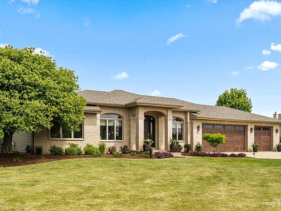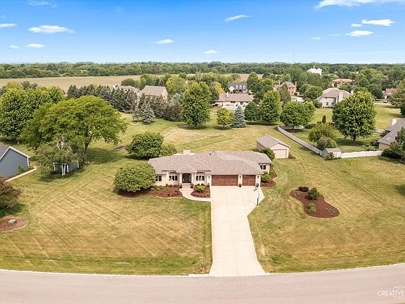 Absolutely stunning one owner, custom built ranch home located on over an acre in tranquil Heritage West Batavia! Step inside and the first thing you notice are the gleaming solid white oak hardwood floors. The foyer is flanked by the spacious dining room and living room with large windows providing lots of natural light. You can't miss the beautiful stone faced fireplace in the coffered ceiling family room with gorgeous built in cabinetry. Continue on to the heart of the home which is warm and inviting with all the features you would expect in a kitchen. Quartz countertops with plenty of seating at the island, stainless steel appliances, wall unit oven, microwave, separate warmer and dual drawer dishwasher. Beautiful built in gas cook top with custom tile work and hood. Large eating area that accesses the backyard through the new sliding glass door. Huge primary suite is truly a sanctuary! Walk-in closet and bathroom complete with dual vanities, separate shower and whirlpool soaking tub for relaxing in. One of the remaining three bedrooms is also an en suite perfect for overnight guests. Finished basement with full bath has plenty of space for entertaining, watching movies, hobbies, games or whatever you can dream up! Don't forget to bring your toys - there is room for them all in the massive 20 x 30 shed/outbuilding. Gorgeously manicured yard with concrete patio makes for a great place to BBQ and hang out with friends and family. Enjoy the convenience of this ideal location away from the hustle and bustle yet close proximity to I-88, Metra, schools, shopping and the Tri-City corridor. You truly don't want to miss out on this one!