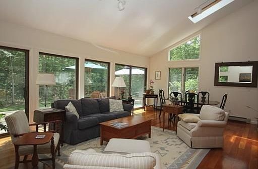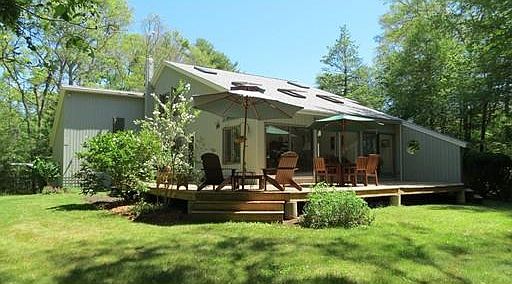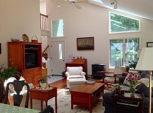 Privately located on over an acre of land is this beautiful contemporary home! This lovely home offers a first floor master bedroom and bath, living room/dining room with gleaming cherry hardwood floors, skylights, pellet stove and sliders that lead to a spacious wrap around deck. The deck offers plenty of sunshine in the afternoon and a private backyard with perennial gardens. The kitchen is bright and offers modern appliances and a breakfast nook. Washer & Dryer and half bath are located off the kitchen. The second floor has a study/playroom, 2 spacious bedrooms with a shared full bath and a perfect home office that is tucked away from the rest of the house with a private entrance through the garage. This home is located in a lovely neighborhood and close to conservation land, walking trails, and the beautiful beaches of Dartmouth!