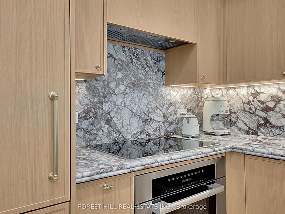 Exquisitely renovated with premium finishes this beautifully reimagined condo features a seamless open concept design anchored by a show stopping kitchen adorned with exotic natural stone countertops, backsplash, and a waterfall double bullnose edge. Warm white oak cabinetry, brushed brass fixtures and hardware, high-end integrated appliances elevate the space with modern elegance. Custom millwork in the front hall, Parisian inspired mouldings. classic chevron hardwood flooring throughout infuses timeless character. Every door, hinge, and marble handle has been thoughtfully curated. The primary ensuite continues the luxurious design with white oak custom cabinetry and full height stone slab walls and floors, creating a serene spa-like retreat. Designed by DVIRA Interiors, this special condo is located in one of the finest luxury buildings in Yorkville, offering 5 star amenities.