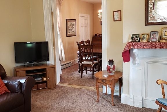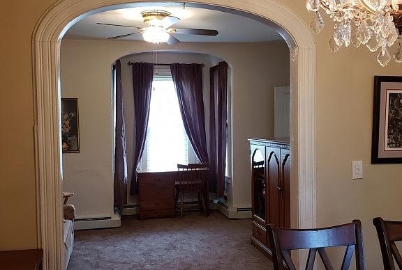 Large 3 Bedrm 2 Full Baths, Classic Colonial with Pocket door and wide archway trim.Formal Dinning Rm. Eat in Kitchen w/plant box window.Old world Charm Home that fronts on two roads for easy parking. Two Zone heat, Five Ceiling fans and four window A/C units.Rear Deck 15x7 off Kitchen and a 20x10 covered front porch.Electric, windows, siding, thermal windows are updated. Kitchen has granite counter tops and maple finished cabinets