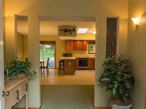 This fantastic village home is a modern take on a traditional ranch. With vaulted ceilings and skylights, the open floor plan is spacious and inviting. It features LR w/FP, Kit w/bar seating, DR w/slider to back yard. Large MBR suite contains walk-in closet, jacuzzi tub and along with 2 guest BR's has been recently carpeted. Maximum storage at every turn: pantry, garage w/bonus room above and huge walkout basement full of potential! Front deck overlooks lovely landscaped 1 acre. Maintenance free and move in ready, it's a must see!