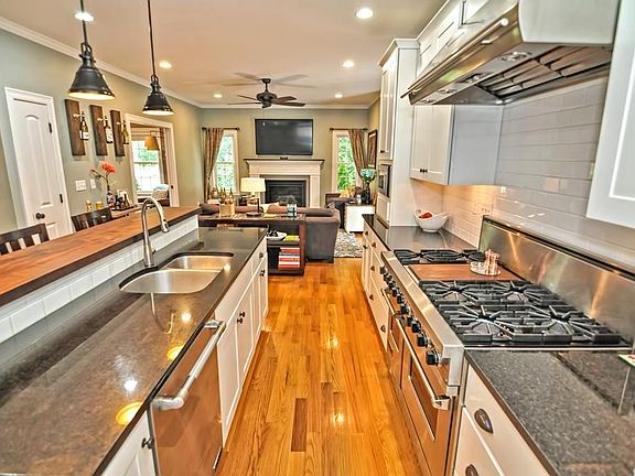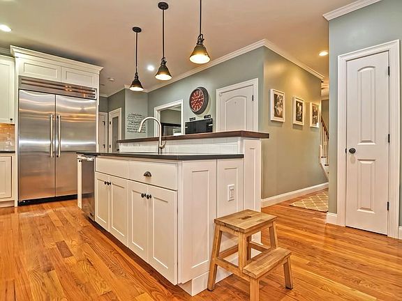 - Kit Dscrp: Flooring - Hardwood, Countertops - Stone/Granite/Solid, Kitchen Island, Recessed Lighting, Lighting - Pendant