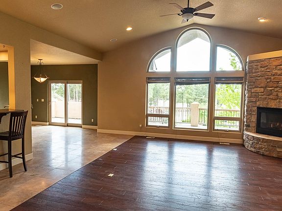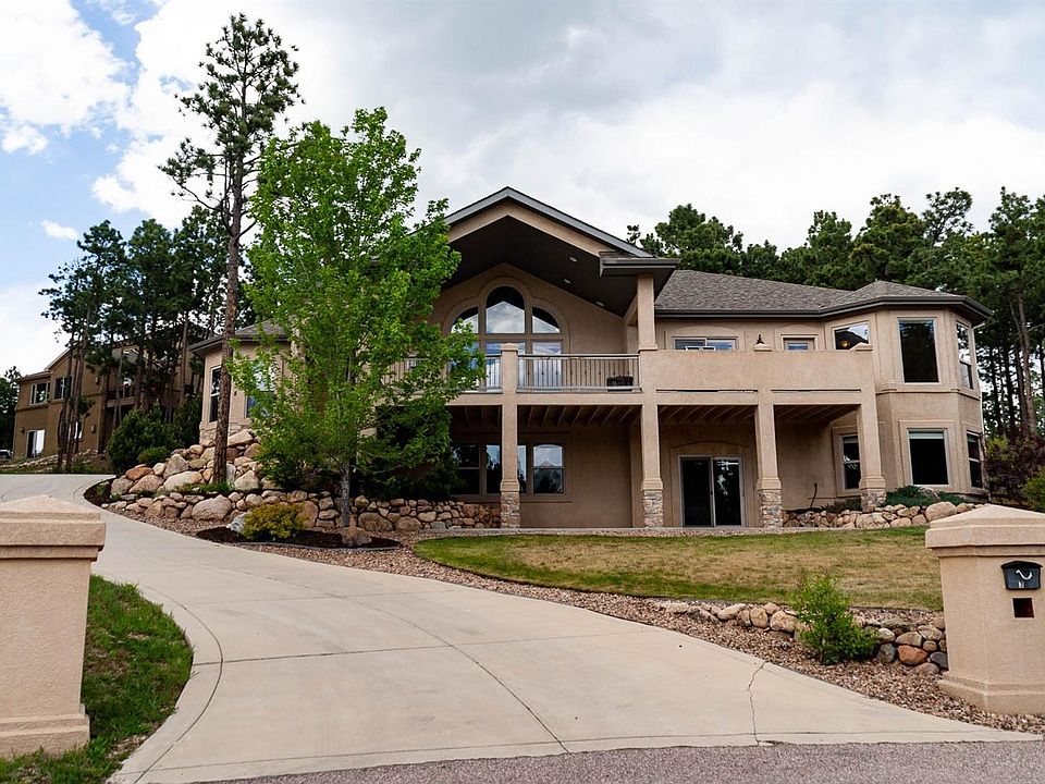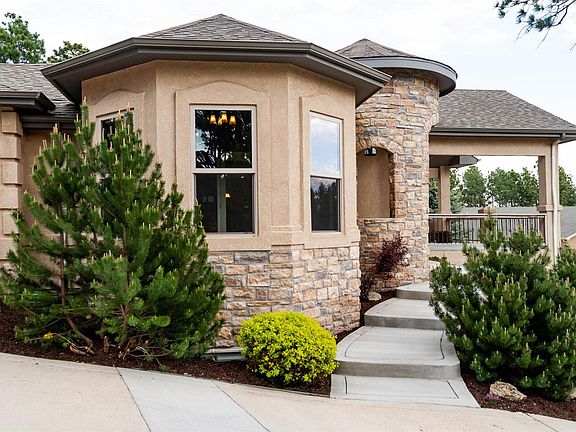 Easy commutes to Denver and Colorado Springs, but you will never want to leave! Gorgeous custom ranch home on a wooded lot with beautiful mountain views. Main floor living! Open floor plan with stone tiled and hardwood floors, spectacular kitchen, breakfast nook, formal dining, master suite, second bedroom, full bath, private office w/French doors, large laundry/mudroom and walks out to the large decks and patio. Double the living/entertainment space in the beautifully finished walk-out basement. Pool table and snow blower stay.