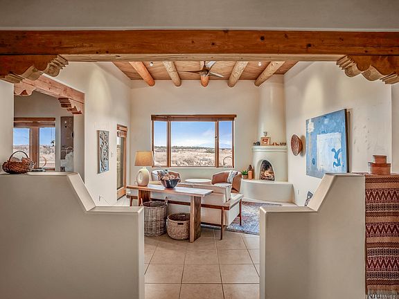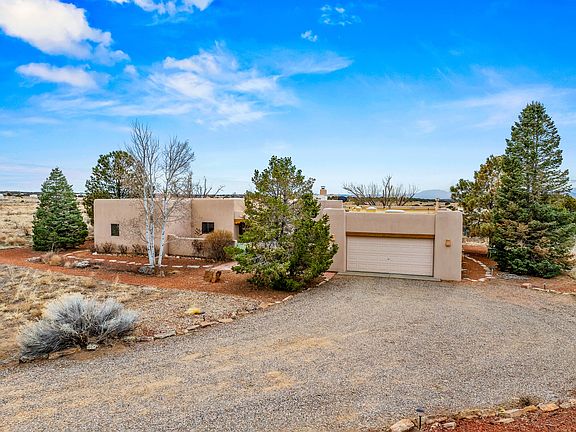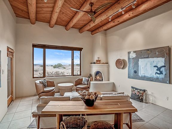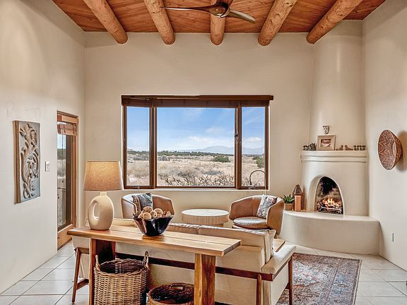 Experience the perfect blend of elegance, comfort, and breathtaking views in this stunning 4 bedroom, 2 bath home, set on a premier 6.85 acre lot in the sought after La Paz at Eldorado. Overlooking the Ortiz and Sandia mountains, this residence offers a peaceful retreat with unparalleled New Mexico sunrises and sunsets. Step inside to a light-filled living area featuring high ceilings, vigas, and a charming kiva fireplace. The well-appointed kitchen boasts stainless steel appliances, granite countertops, and an inviting dining area. The spacious primary suite is a private sanctuary, complete with its own kiva fireplace, a luxurious bath with a soaking tub and walk-in shower, a California closet system, and French doors leading to the serene rear courtyard. The three additional bedrooms provide versatility and ample space, with one currently serving as the Seller's inspiring art studio. Outdoor, a covered patio, pergola, and walled courtyard create an intimate setting for relaxation or entertaining, seamlessly extending your living space into the natural beauty of Northern New Mexico. This exceptional home offers the best of Santa Fe living.