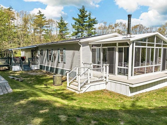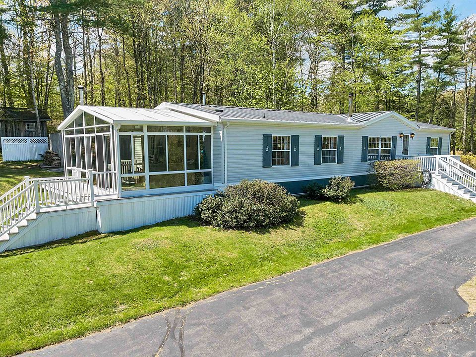 Wow, what a find! One floor living! This 3 bedroom, 2 full bath manufactured home over 2,000sq ft is so much more than you may imagine. With ample open living space and lots of natural light provided by sizable windows and skylights. Two woodstoves including one on the 20x12 ft sunroom, a lovely place for spending your time relaxing. Plenty of parking, plus a 2 car garage (added in 2007). With notable privacy, this 2.5 acre lot presents fruit trees, resident birds, garden, and a goldfish pond. Several terrific outbuildings for storage including a long wood shed. See floor plan in pictures. Whole house generator! 9 minutes from the tip of Alton Bay, and 4 miles to Gunstock Mountain, don't miss out on this wonderful home. First opportunity to view at open houses Friday May 17th 4:00-6:00, and Sunday May 19th 11:00-1:00. Please see the video tour!