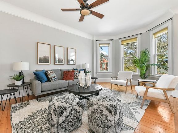 Open Houses canceled - offer accepted. Spectacular, open feel with 10’ ceilings and abundant natural light in this central JP 2nd floor home. 3 bedrooms with good closets and beautiful exposed brick in main bed. Maple & stainless kitchen offers granite breakfast bar & recently upgraded appliances, new faucet, pendant lights, and lots of storage space including pantry closet. The dining room is highlighted by gas fireplace & original moldings, and is wide open to the large living room with room for a home office in the bay window. Interior features include curved ceilings, original wood flooring, central air, large private basement storage room, newer in-unit laundry, renovated bath. Fresh paint interior + exterior done recently. Great outdoor spaces include shared side yard with blossoming tree + designated large roof deck area with water, perfect for gardening & entertaining this summer. Driveway parking, pet friendly + 100% owner occupied.