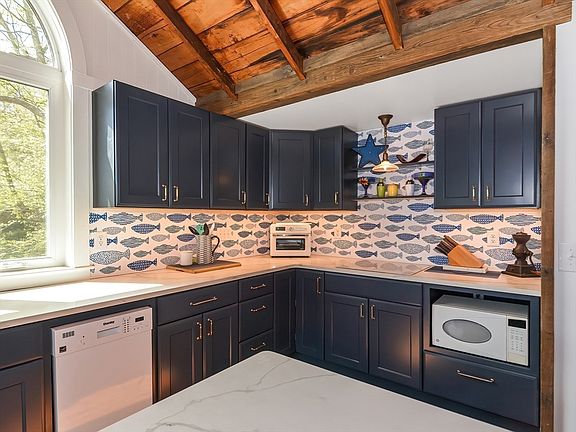 This incredibly charming waterfront cabin is a little slice of heaven. Quietly tucked away on Tucker Pond, this 3-season home has been lovingly maintained & updated over the past 10 yrs. The stunning custom kitchen is sure to impress- white quartz ctps, upgraded appliances, island, & vaulted ceiling w/ a slider to the deck. Rustic + cozy family room w/vaulted, beamed ceiling & custom cabinetry. The bedroom is quaint yet luxurious. Finished porch is great for a dining area & overlooks the pond. The spacious deck will allow you to entertain or just unwind and take in the breathtaking sunrise while sipping your morning coffee. There's no shortage of wildlife- from ducks to hummingbirds & more. Adorable Bunkhouse can sleep up to 5 guests. Temporary dock for fishing or canoes/kayaks. Updates include: Vinyl plank flooring; Newer metal roof; Mini Splits for heat/AC; Most windows replaced. You'll feel like you're someplace far, far away, yet you're close to it all. Won’t qualify for all loans.