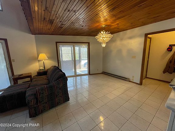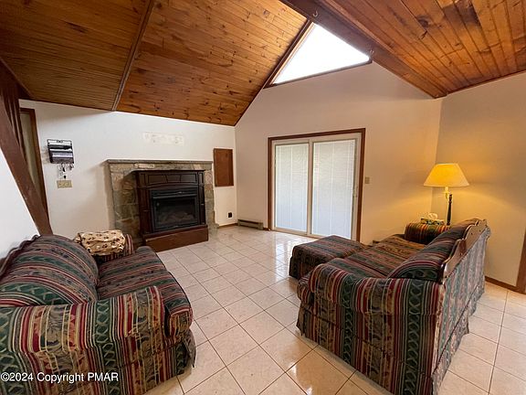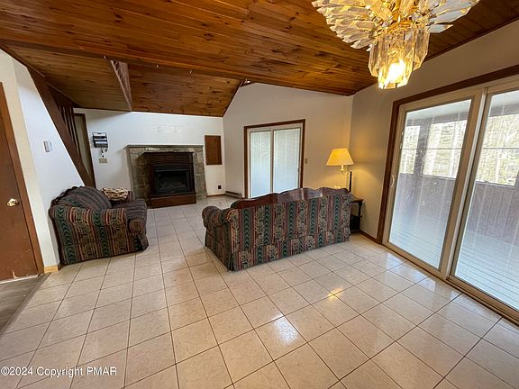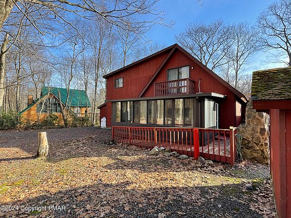 Discover your dream home nestled in the woods of the Pocono Mountains! This spacious 5 bedroom, 2 bathroom Chalet offers ample space for family and friends and has been freshly painted (inside and trim outside) and had NEW windows and slider installed March 2024! New 3 Season Rm floor May 2024! This home features an extra bonus room off the garage that can easily be converted back into a second garage, PLUS a separate workshop space in the garage. The main floor consists of 2 bedrooms (the second can serve as an office, den, or pantry), 1 bathroom, an open layout, newly renovated kitchen and a 3-season room. Upstairs, enjoy a large loft, 3 additional bedrooms, and another full bathroom. Enjoy the outdoors enjoy all that the community has to offer (executive golf course, swimming pool and playgrounds just to name a few)!