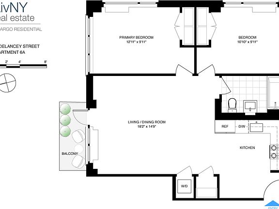 Perched on a sunny corner in the sky with quiet North-East views, 38 Delancey is a condominium in the center of the Lower East Side and a block from NoLita. Apt. 6A is a spacious, corner 2 bedroom with a private balcony and floor to ceiling windows that let in tons of light. There is a large living room with flexible dimensions, offering plenty of room for a dining & home-office areas. Additional highlights include lofty 9.5 foot ceilings, inviting open kitchen with stainless steel appliances including a gas stove, as well as a washer/dryer that vents out, and an extra-large bath.