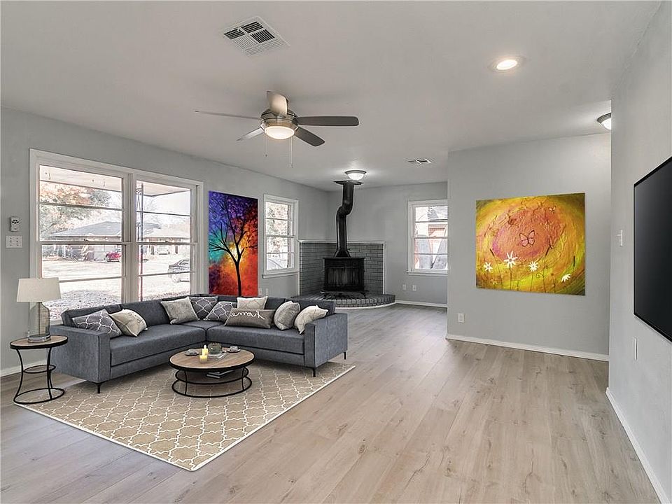 ~Edmond Schools, REMODELED, & less than $140k!~ Walk in and feel the ambiance of your home being a clean, modern, welcoming space. This home was refreshed with new floors, new paint, granite, backsplash, brand new stainless steel appliances, upscale light fixtures & ceiling fans in every room, exterior paint, shutters, & more! The garage was converted into a bedroom with a walk-in closet on the opposite side of the home as the others. It could be a private master or a kid's room with lots of storage! The other 2 spacious bedrooms have had their wood floors refinished & are gleaming and are near the remodeled bathroom! The kitchen is a show-stopper; the home sits on a huge lot with an alley way in the back & the gate opens large enough to pull in an RV or boat; The home is second to last on a dead end street so there won't be any through-traffic. The neighborhood is well-established and pride of ownership shows. This is the perfect place to call home!