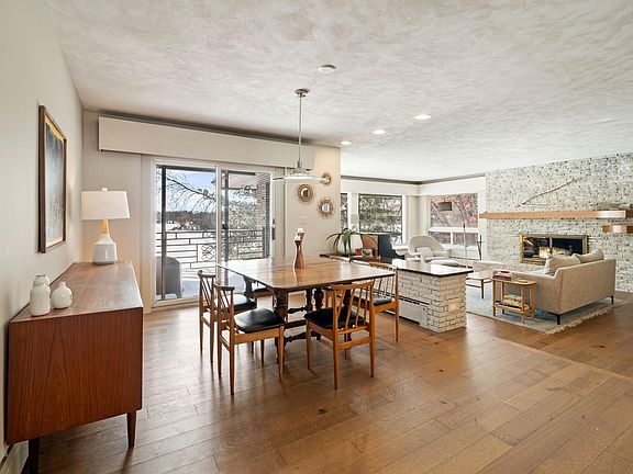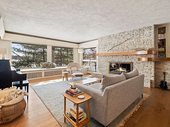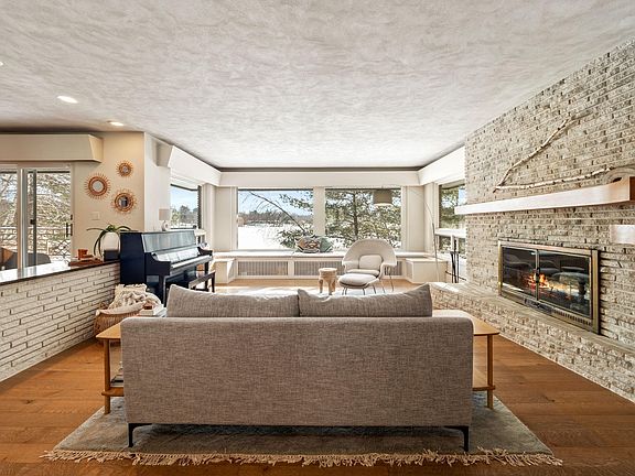 This beautiful midcentury modern home is nestled on 3.7 acres, with 267 ft of shoreline on Gilfillan Lake. The main level includes 4 bedrooms, 2 full bathrooms, expansive windows in the kitchen, dining and living room with natural light & vast lake views. The kitchen includes a SubZero fridge, water osmosis system, island cooktop and entryway to the floating deck. The finished basement features a wet bar, work room with desk, floor to ceiling windows in the family room, a fireplace and a large recreational space to make your own. Down the hall, find a secondary living suite with a kitchenette, bedroom, and full bathroom. The laundry room is spacious with plenty of storage. The lower level walkout invites you to enjoy the patio and private yard with stunning views, prairie flowers, trails through the mature trees, and plenty of gardening space. Lastly, this gem is located in the sought-after Mounds View School District.