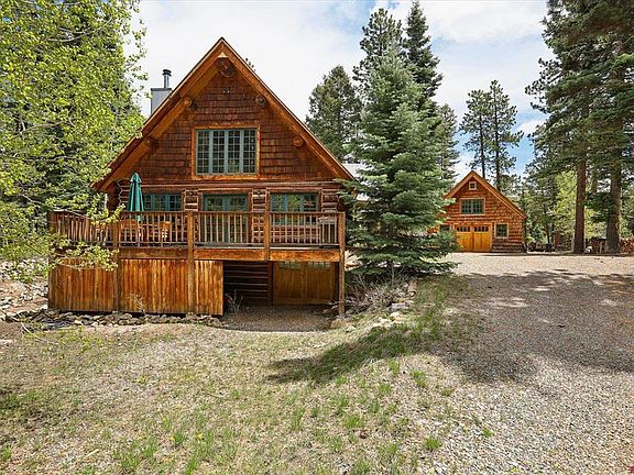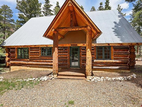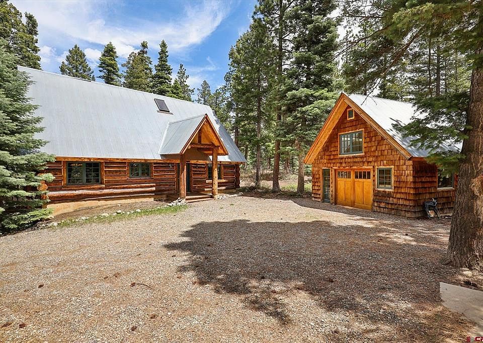 Nestled in the picturesque Lakewood subdivision, this captivating log cabin mountain getaway provides a harmonious blend of timeless charm, exceptional craftsmanship, and natural splendor. Located just 10 minutes from Purgatory Ski Resort and 20 minutes from historic downtown Durango, this haven in the pines provides boundless possibilities. Beautifully crafted by the seller, the home’s original owner, the custom furniture, cabinets, and built-ins exude quality. Constructed in 1994, the rustic charm of the dead standing spruce logs, dried by nature prior to construction, adds character to the home's exterior and interior. Warmth emanates from a real wood-burning fireplace nestled within a local moss rock surround, creating a cozy atmosphere for gatherings. The kitchen boasts new quartz countertops, complemented by stainless steel appliances, including a dishwasher installed in 2024. Soaring vaulted ceilings frame panoramic views, with thoughtful window placement bringing in abundant natural light and vistas of the majestic cliffs, which you can also enjoy from the spacious deck leading out from the living room. Pine floors and the tranquility of its private location amidst stunning natural surroundings complete the inviting ambiance. The main floor features a welcoming air-lock entry mudroom with slate tiles and built-in cabinetry, perfect for storing goods and gear. In total, the house sleeps eight. There are two main level bedrooms, one with twin beds and a desk, and a second with queen bed, handcrafted blanket chest, and armoire. Both bedrooms are oriented to take in the private views to the back of the property. Sleeping arrangements also include a queen size sleeper couch. The primary suite upstairs has thoughtfully designed built-in drawers, cabinets, and a spacious walk-in closet. The office loft offers a serene workspace illuminated by a skylight. The unfinished 1200 square-foot basement provides a laundry area, ample storage, and room for toys, such as a snowmobile or ATV, complete with garage doors that swing open for easy access. Additional features include a large-capacity Marathon water heater, Lennox furnace, and new dryer. The property also hosts an insulated detached garage/workshop with wood floors, a loft space, and 220V power, which could be converted to a guesthouse. With its log home aesthetic, metal roof, and a prepped pad for a carport, this property blends rustic charm with modern convenience. This home is offered fully furnished and could be a vacation rental investment opportunity (see attached revenue projection analysis from VRC). The adjacent 1-acre parcel, also owned by the sellers, provides further potential for expansion or preservation of the captivating surroundings. With its low road maintenance agreement of approximately $900/year, which includes snow removal on the roads and driveways, this never-before offered home is a must-see for anyone seeking a meticulously maintained, handcrafted mountain retreat. Act swiftly to seize this rare opportunity, as it is sure to appeal to discerning buyers seeking a harmonious blend of luxury and natural splendor.