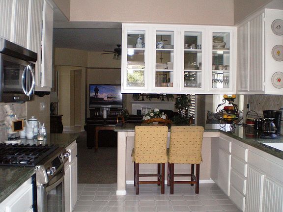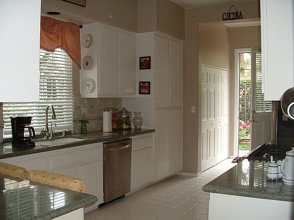 Single story Cottage style home that's rarely on the market features 2 bedrooms plus an office. Spacious open floorplan includes a comfortable living room w/ cozy fireplace opening to the dining area & gourmet kitchen. The kitchen has been updated w/ granite counters, tumble stone backsplash, & stainless appliances. Glass fronted cabinetry, breakfast bar, & a desk area accent the room. The dining area features a sunny bay window & window seating. The master bedroom suite is highlighted by glass doors leading out to a quiet patio area. The spa-like bath includes a soaking tub & separate stall shower. A large walk-in closet is enhanced w/ built in shelving. The office area can be used as a study, music room or homework area too. The secondary bedroom has mirrored closet doors & adjacent full bath. Upgrades throughout the home include plantation shutters, ceiling fans, neutral carpet & tile flooring. The charming & private yard is accented w/ a brick patio & flower garden.