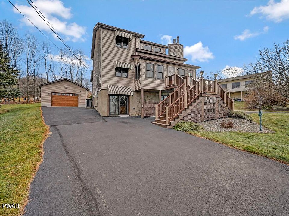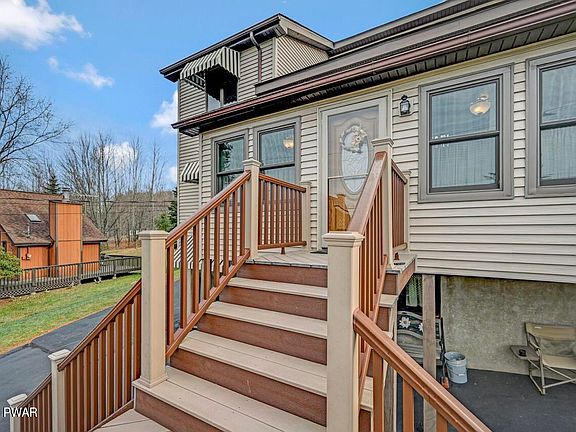 Located in The Hideout, a four-season amenity filled community in The Northern Poconos. Welcome to a meticulously maintained residence offered by its original owners, a true testament to pride of ownership. The exterior features a neatly paved driveway and durable vinyl siding. The detached garage, equipped with heating, serves as a versatile space for hobbies or storage. Set on a level lot, the property offers ample outdoor space for various activities. Inside, the main level showcases hardwood flooring, creating a warm and timeless atmosphere. Central A/C and heating ensure year-round comfort, Anderson windows too. High ceilings and a loft overlooking the living room add an open and airy feel. The updated kitchen is adorned with quartz countertops and stainless steel appliances, offering modern functionality. Two enclosed porches, front and rear-facing, seamlessly blend indoor and outdoor living. The living room, with a brick fireplace and propane logs, radiates charm and coziness. The lower level features a spacious recreation room with a wet bar, perfect for entertaining. With meticulous attention to detail evident throughout, this home offers a seamless combination of modern amenities and classic charm. It's not just a residence; it's a place where memories are made. Don't miss the chance to claim this meticulously crafted home as your own--a truly unparalleled living experience awaits.