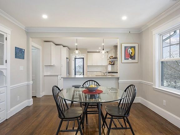 LOCATION, SPACE & RENOVATED! Move right in to this recently renovated 4 bed, 2 bath duplex-style condo with garage parking, master suite & AC in prime commuter location on Roslindale/W. Roxbury line! Tree-top oasis on coveted one-way street two blocks from Bellevue Commuter rail T-station w/ bus routes at top of street. New open kitchen w/ white cabinets, upgraded s/s appliances, quartz counters, & pantry leading directly to private porch with views of Roslindale Hills. 3 beds, living room, dining room, sunroom & full bath on main floor, with new master suite on second floor, marble bath w/ double vanities, W/D hookups. Walk to both Roslindale & W.Roxbury shops/restaurants! Original features such as double picture molding, h/w floors, two sets of french doors. Garage and off-street parking, replacement windows, architectural shingle roof, Navien tankless h/w & new Central AC, Nest & Ring, fully fenced common yard & patio, private basement storage, & pet friendly! PRIVATE SHOWINGS NOW!