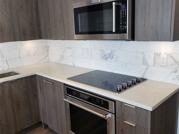 Never Lived In, Bright, 2Bdrm + 2 Bthrm Corner Unit Featuring Wrap-Around Balcony With Walk-Outs From Living And Master Bdrm. Modern Kitchen With Surface Top Stove, Intergrated Refrigerator, Undermount Sink, Backsplash, Granite Countertops, And Large Island That Comfortably Seats 2 Or More. Minutes To Rogers Centre, Scotiabank Arena & Downtown Core. Conveniently Located.