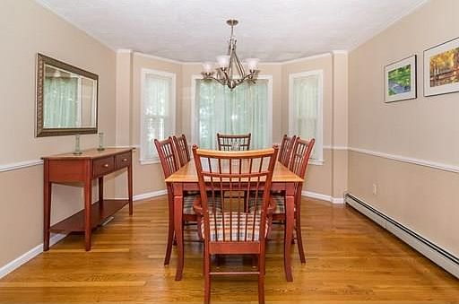 Beautiful hip roof colonial set on private wooded lot in desired neighborhood of Matthew Estates. Open floor plan features large kitchen with center island, custom built-in storage, stainless appliances and walkout bay with slider to deck, open to a family room with fireplace, dining room with walkout bay window & hardwood, living room with hardwood, 1/2 bath and 1st floor laundry. 2nd floor features: large main bedroom suite with walk-in closet & beautifully UPDATED full bath with tile shower and granite counters, 3 additional good sized bedrooms and a 2nd UPDATED full bath with dual sinks, granite counters & tile floor. The finished basement has spacious playroom and an exercise room. Other features include hardwood floors, UPDATED baths, replacement windows, NEW roof, fascia & gutters, composite deck GAS heat and cooking and more! Set on a private wooded lot in great location, convenient to shopping, major highways and commuter rail.