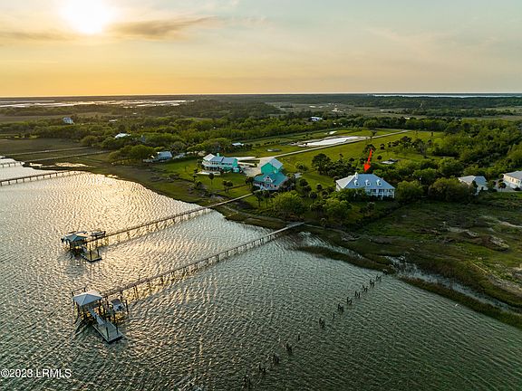 Nestled among live oaks is a RARE opportunity to own private dock on the Morgan River with deep water. Direct access to the Intracoastal waterway. Secluded private neighborhood is only 12 minutes from town. Unique panoramic views can be enjoyed from 2500 ft of wrap around porches with French doors. Water views from nearly every room! This stunning Southern plantation style home is original to the owners with many custom features and meticulous details. Kitchen boasts all custom cabinets with granite counters, double islands, 6 burner gas cooktop, double ovens, icemaker, garbage compactor and all stainless steel appliances. Approximately 20' by 34' great room with coffered ceilings and custom beveled waterglass doors and cabinets is breathtaking. Heart of pine floors throughout the first floor with marble and stone in the master bath. Separate his/her toilets and vanities, marble shower, soaking tub and walk in closet. Upstairs has two master suites with private baths and a bonus area. Fourth bedroom upstairs has two closets, water view and a 9 ft. pool table currently used as a pool room. Tons of extra storage can be found throughout this home with long and deep closets. Other details not to miss are 10" crown dental molding, bronze and crystal chandeliers throughout. Dock built new in 2018 with two 13,000 lb boat lifts, a 24 ft. aluminum ramp and a 12 by 30 ft float. New standing seam metal roof. This home has a Pelican whole house water filtration system. 2 car garage plus an abundance of room under the home. A must see to appreciate all the special features! The Sam's Point boat launch is a 1/4-mile away. The property has no covenants, no restrictions and no HOA.