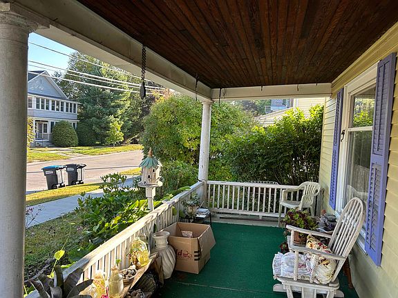 Spacious family home featuring a paint finish called Lazure throughout.You'll love the updated kitchen with maple cabinetry, granite c-tops wood topped island cork flooring,Most floors are Birdseye Maple with unique tile floors in both the 1st floor bath with jetted tub & the laundry room.The huge (family room/work office/bedroom on 1st fl) special side entry in case you have an in house business, has a slate tile area with patio door opening to the deck.The generous dining room boasts a built in china cabinet.Upstairs are 4bedrooms, a family bath, and a walk-up attic.Buderus heating system, updated wiring.Sit back on the front porch, or entertain on the back deck overlooking a beautiful perennial garden with minimal lawn mowing.There are several varieties of berries in the garden.You can even make your own wine & store it in the wine cellar!A two car garage completes the picture.It's just a short walk from this very special home to schools, parks, and shopping.