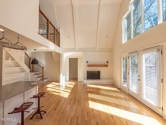 Enjoy stunning views and peaceful surroundings in this charming blue A-frame home. Step into a light-filled living area featuring vaulted ceilings with exposed beams, a double-sided brick fireplace, and large windows with French doors that open onto an oversized deck overlooking the lake. The wood floors add warmth throughout, while the kitchen and dining area offer a cozy yet open layout. Located in the heart of Whispering Pines, residents have access to several lakes, parks, and picnic areas perfect for outdoor living and recreation. Pets considered on a case-by-case basis.