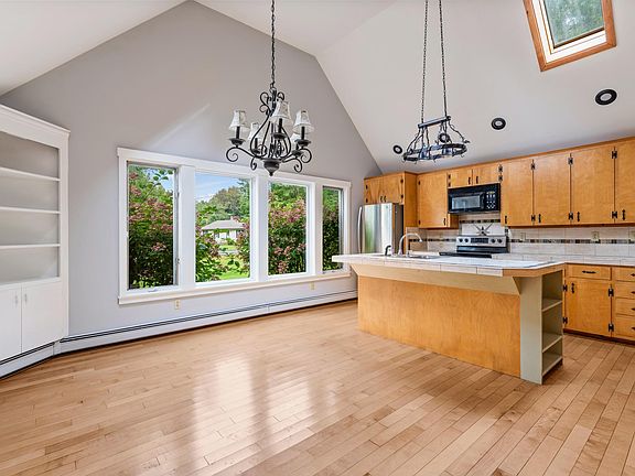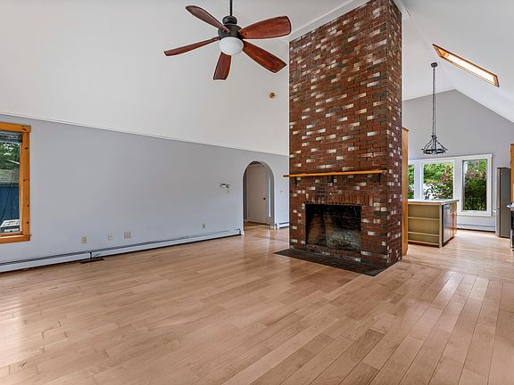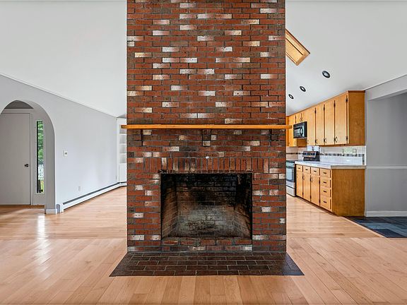 RANDOLPH - Contemporary home with impressive fireplace and cathedral ceiling in the kitchen, dining and living room area. 4 good size bedrooms! Primary bedroom with custom bathroom! Detached garage with apartment upstairs. Fresh paint throughout the home! Move in ready! Nice neighborhood with front and back yard.