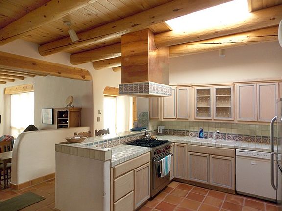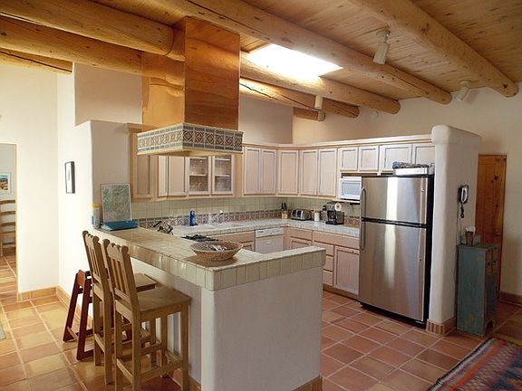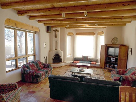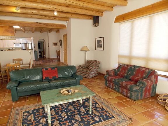 Massive views, a front courtyard that's walled for privacy, and a pretty turquoise door that symbolizes hospitality and protection welcome you to this beautiful property in the Los Altos Subdivision. This 4BR/4BA/3145sf property comprises a 3BR/3BA/2673sf adobe main house, a 1BR/1BA/472sf casita, and an oversized one-car garage, all set on more than half an acre of gently sloping valley land in one of Taos's most desirable subdivisions. In the main house, the sunken great room has a corner kiva fireplace, as does the master suite, which also has a spa tub, a talavera vanity with double sinks, and closet built-ins. Tall T&G/viga ceilings, skylights, and hard-trowel plaster walls of a light neutral color keep living space bright and light. The main house includes a media room with built-in bancos, a dedicated laundry room with front-loading Tromm washer and dryer, and a home office that's right by one of the home's numerous exterior doors, which makes for a great client entrance. The kitchen has a Wolf stove, a copper hood with talavera accents, a stainless steel fridge, a Kenmore microwave, and a Kenmore dishwasher. Outside are several flagstone patios and a hot tub. Steps away from the main house and adjacent to the garage is the casita, a sleek little dwelling with a full bath and an open floor plan that accommodates a great room, full kitchen, and bedroom; the casita also has a stacked washer and dryer. Outside and up a spiral staircase is the roof deck, from which you can enjoy unparalleled panoramic views. Need we say more? Okay, we will. This fantastic property is turnkey!