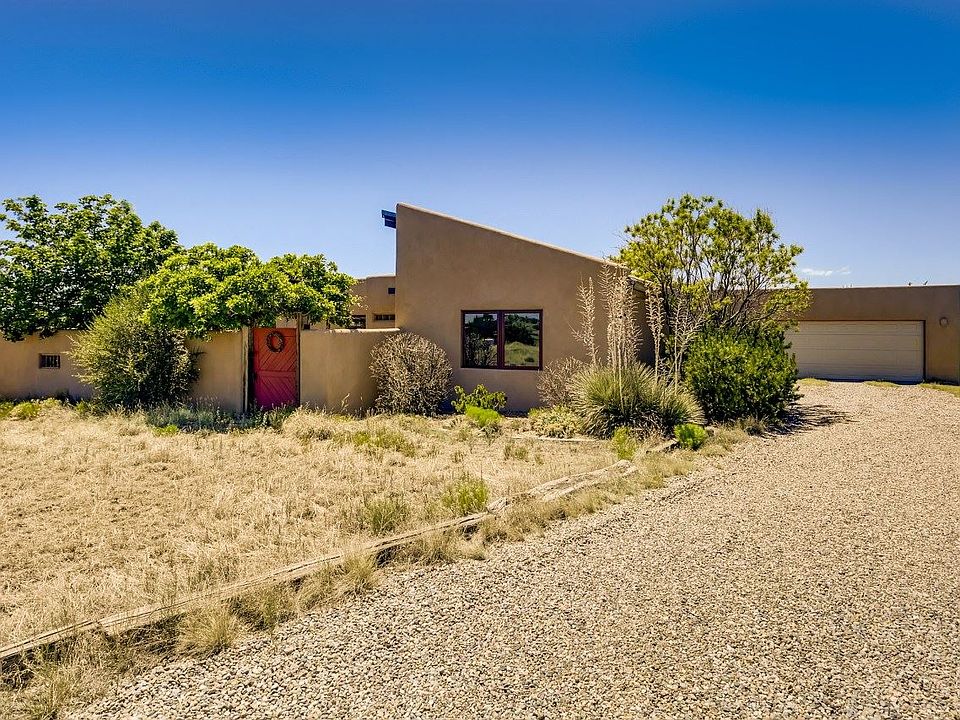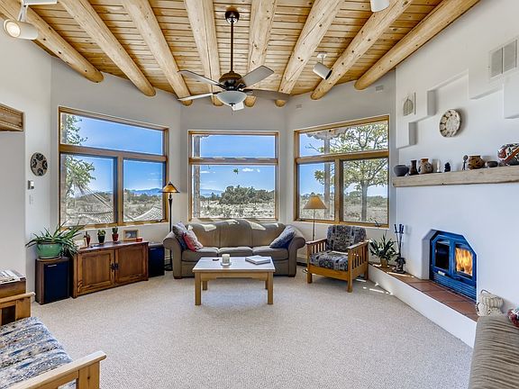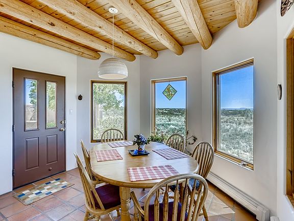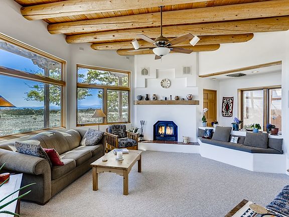 Views Galore in Eldorado! Custom passive solar, 1984 sq. ft. open design with popular split 3 bedroom plus office/den. Large separate owner suite, large kitchen with sunny breakfast nook and an uplifting spacious living room with central heating fireplace. Gas hot water baseboard heating and evaporative cooling. Wonderful location bordering the historic railroad county maintained rail trail, wake up to fabulous mountain views, dine to sunset ambiance and enjoy the privately walled courtyard hot tub. Welcome to Eldorado and local community amenities or take the short drive into historic Santa Fe.