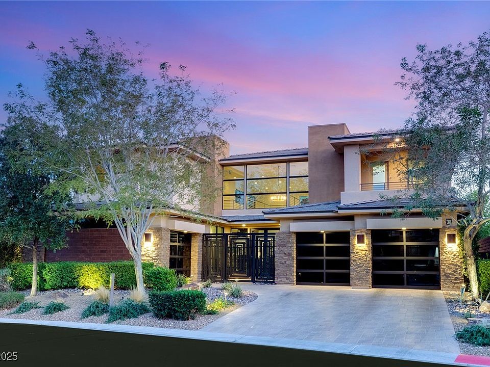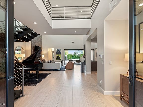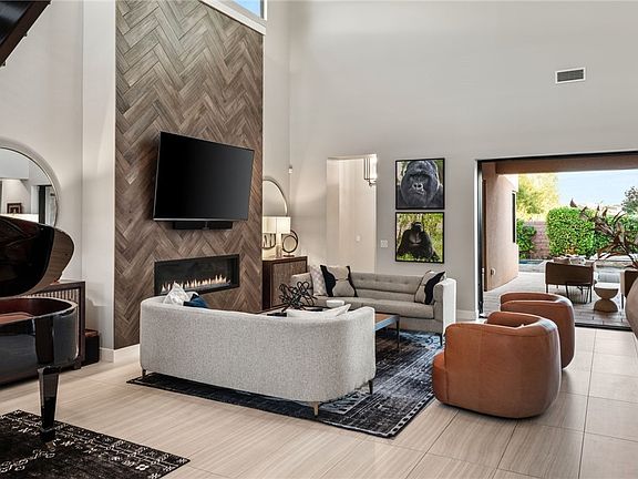 Floating staircaseGated courtyardStriking pivot doorSleek linear fireplaceMarble countertopsSunken fire pitGourmet kitchen