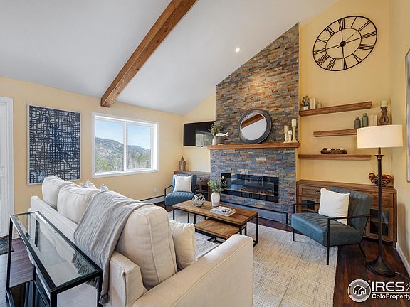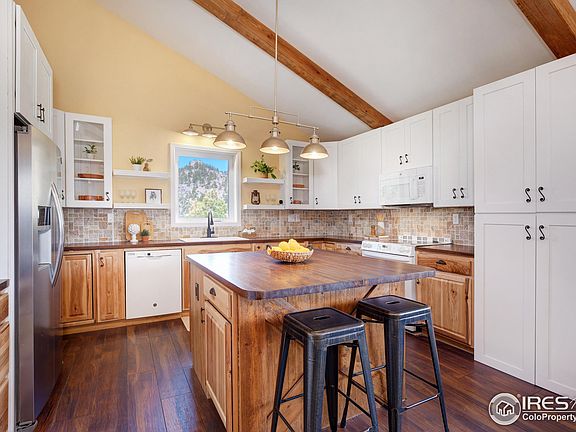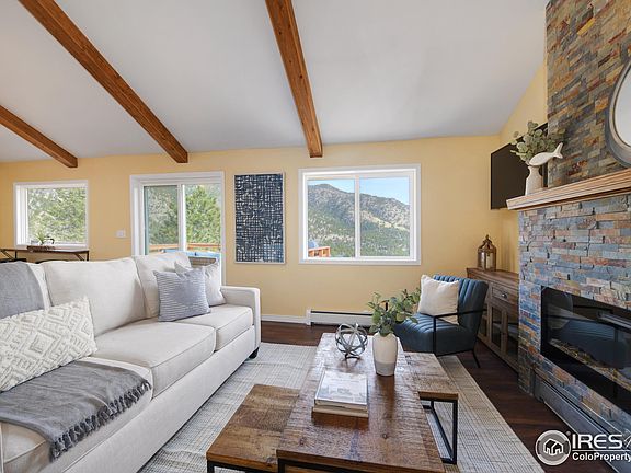 Discover the charm of Pinewood Springs in this beautifully updated mountain retreat, offering sweeping views of the surrounding forest. This thoughtfully designed home blends modern elements with a mountain personality. The bright, contemporary kitchen features an expansive island, high ceilings, and large windows that flood the space with natural light-perfect for both casual living and entertaining.The lower-level walkout provides a versatile living space, including a cozy living room, guest bedroom, and direct access to the attached garage and spacious utility/laundry area. The home's warm and inviting atmosphere extends to the large deck, where you can relax and take in the breathtaking scenery.Fire mitigation efforts and a newer roof with the highest fire-resistant rating ensure peace of mind. The exterior is wrapped in noncombustible James Hardie board siding, offering durability and energy efficiency. An attached one-car garage and garden shed provide ample storage for outdoor gear.With no HOA, Pinewood Springs residents enjoy unique amenities, including a rural water system and year-round road maintenance through county tax districts. The community also enjoys a unique private swimming hole on the Little Thompson River, ideal for summer relaxation. Roosevelt National Forest surrounds the neighborhood, offering endless opportunities for hiking, mountain biking, and wildlife viewing.Conveniently located just 10 minutes from downtown Lyons, 20 minutes from Estes Park, and 30 minutes from Boulder and Longmont, this property offers the perfect balance of seclusion and accessibility. Experience the best of Colorado mountain living with modern updates and unparalleled natural beauty.