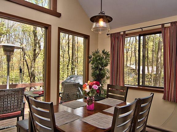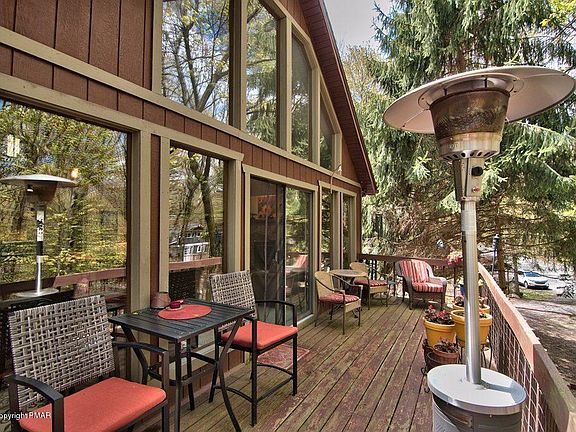 This Charming Raised Chalet sits on 3/4 acre in Lake Harmony Estates. Access to Sandy Beach/Boat Dock Area on Lake Harmony with Marina access to ''motorboat Lake Harmony'' Kayak included. 2 Full Bedrooms, large sleeping loft, 2 Full Bathrooms, Den/game room. Cathedral Living Area with wood burning fireplace. Full floor to ceiling windows for all Season Views. Fenced yard, Central AC/heat, Garage. Private setting at end of Cul-de-sac. Partially Furnished.