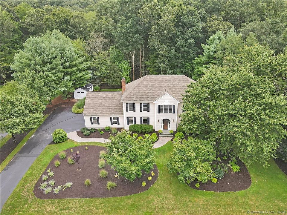 First time on the market, this 4-bedroom, 2.5-bath colonial nestled on a picturesque 1-acre lot in a desirable cul-de-sac subdivision. Meticulously maintained, this light-filled home offers an array of features, including hardwood floors throughout the main level, crown molding, wainscoting, and charming custom built-ins. As you approach, a paver walkway leads to the inviting front entry, which opens to the foyer, past the powder room to a beautifully updated eat-in kitchen, where culinary dreams come to life. The kitchen showcases custom cabinetry, a center island, granite countertops, tile backsplash, a farmhouse sink, and higher end appliances, including a Cafe oven with a 5-burner gas cooktop, DACOR microwave, refrigerator, dishwasher, and a built-in pantry with pull-out drawers. The dining room seamlessly flows to living room, which can easily double as an office. The cozy family room is a true retreat, featuring a fireplace with a pellet stove insert, creating a warm and inviting atmosphere for intimate gatherings. Glass sliders open to a deck and spacious bluestone patio, providing the perfect setting for outdoor entertaining. The master bedroom with 2 walk-in closets and a spa-like full bath featuring a dual sink vanity, a jetted tub, and a generously sized shower, plus 3 additional bedrooms, second full bath and laundry closet complete the second floor. The finished walkout lower level offers a versatile space, ideal for recreation, hobbies or media room. The property's outdoor oasis includes wonderful perennial gardens, a lush, manicured lawn, and a shed for additional storage. This home is the perfect blend of elegance, comfort, and functionality, offering fabulous interior and outdoor spaces
