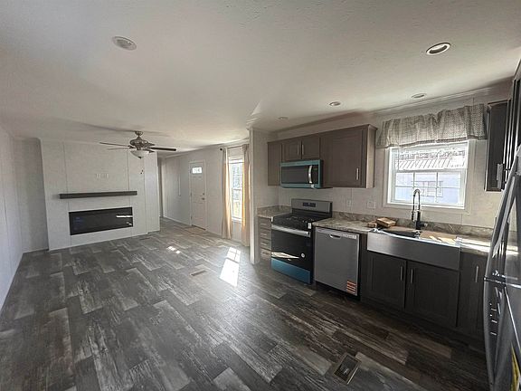 ***FABULOUS LOOKING BRAND NEW HOME***THIS 2025 MODEL HOME IS SO NICE WITH SOME BEAUTIFUL FEATURES AND UPGRADES.  THE HOME IS A 2 BEDROOM AND 2 BATH FLOOR PLAN.  THERE IS AN ELECTRIC FIREPLACE IN THE LIVINGROOM THAT IS SO SLEEK AND STYLISH WITH A MANTEL AND ELECTRICAL TO MOUNT A TV ABOVE THE MANTLE.  THE FLOOR PLAN IS OPEN CONCEPT TO THE KITCHEN WITH UPGRADED STAINLESS STEEL APPLIANCES AND A COOL STAINLESS FARMHOUSE SINK THAT HAS CUTTING BOARD AND STEEL DRYING RACK!!  BONUS:  THERE IS A LARGE HIDDEN PANTRY ROOM OFF THE KITCHEN HIDDEN BEHIND A CABINET...SO MUCH STORAGE SPACE!!!  THE MASTER BEDROOM HAS A WALK IN CLOSET, MAIN HOUSE WATER SHUT OFF VALVE AND A NICE LOOKING OVERSIZED SHOWER WITH TWO SEATS IN THE MASTER BATHROOM!!  THE EASY TO LIVE WITH FLOORING IS SO SLEEK AS WELL AND EASY TO MAINTAIN.  THIS HOME COMES WITH NEW PAVED DRIVEWAY.   THIS PARK HAS A PRIVATE BEACH JUST DOWN THE ROAD ON THE LAKE JUST FOR PARK RESIDENTS AS WELL....ENJOY THE SUMMER BY THE LAKE!!