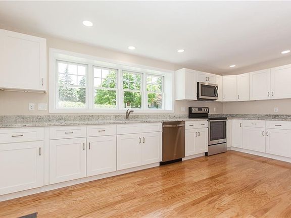 Fantastic renovated Ranch style residence with attached one car garage in the most convenient neighborhood setting within minutes to highway access, shopping & T-station. Gorgeous kitchen w/hardwood floors, new cabinets, appliances, granite counters & boxed bay window overlooking yard. Spacious living room with hardwood floors and new bay window. Completed gutted tiled new bath, all new windows, updated electric, hot water tank & new vinyl exterior. Huge finished basement with plenty of room to spread out. Covered patio area and great corner lot with good sized front and side yard space. Call today to see this truly move-in property.