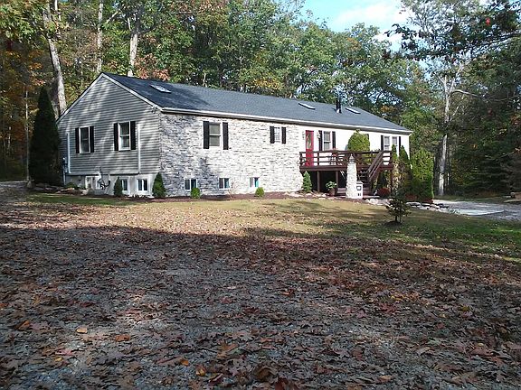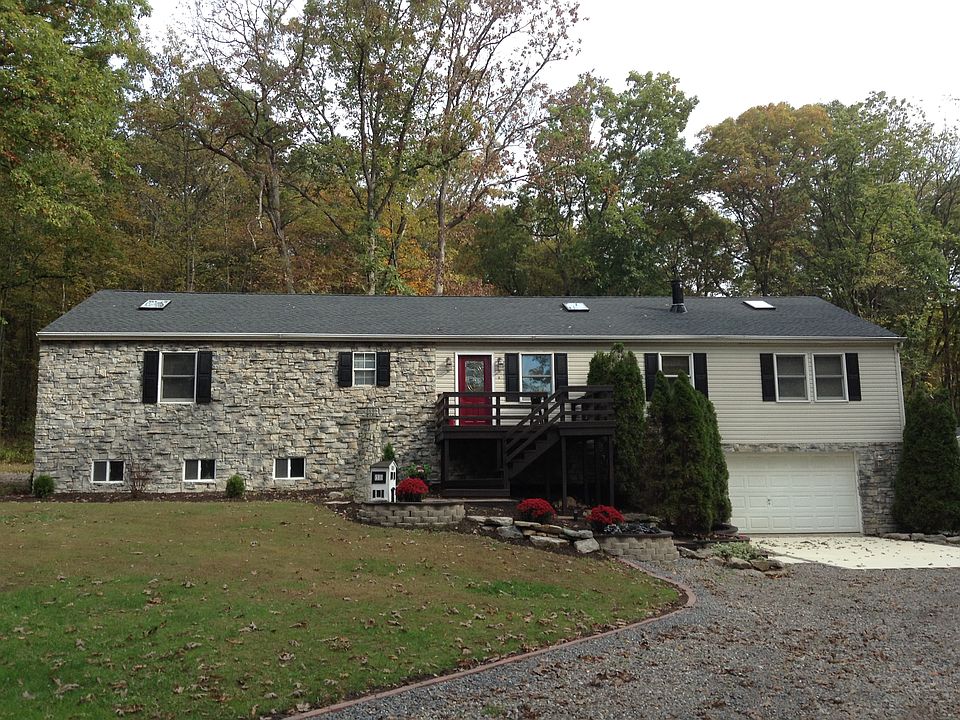 Our lovely home is situated on 1.7 acres next to several acres of woods in a quiet neighborhood. The property has a pond, a stream, and a well. Built in 1994, the house has a stone front, with a unique matching lighthouse in the front yard. Upgrades in 2019 include a new 10-ft x 10-ft matching storage shed on a concrete pad; a new 40-year tech shingle roof; a new heat pump unit for cooling/heating; new African mahogany wood flooring ; a circular driveway around the house; and a new cement patio in front of the garage. Upgrades in 2017 include a screened back porch; new tile in the kitchen; and new tile in the hallways. The screened porch has a double-seated swing, with scenic views of the pond, the woods, and the mountain behind us. All rooms on the main level are spacious, with15-ft vaulted ceilings. The kitchen has an abundance of both cabinet space and counter space. The dining room has sliding doors that open onto a balconey. The living room has a stone, wood-burning fireplace. The master bedroom has a connecting private bathroom and a loft that can be used as office space. The other two bedrooms also have lofts. The basement has a 14 foot wide by 22 foot long finished room that can be used as a rec room or a fourth bedroom. It has tile floors and five windows that provide plenty of natural light. The basement also has a laundry room and plenty of space for a workshop. The landscaping includes many flowers, shrubs, and trees. Our property is conveniently located within a few miles of stores, farmers' markets, restaurants, two golf courses, and two state parks.
