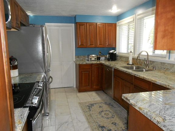 When you enter the Foyer you will notice the marble floor home has. The living room has a brick wall wood burning fireplace and an entrance to one of the three patio areas. The kitchen is a cook's dream cheery, cabinets, granite counter tops, upscale stainless steel appliances and marble floor, that opens to the large family room with access to the 2nd of 3 patio areas and the family room also has marble flooring. The home has 3 bedrooms with wood flooring throughout. The master bedroom has great closet space along with the 3rd access to the patio. There are two full baths. Outside there is a huge very private and wooded lot with iron & wood fencing, along with a great front porch area. Two car attached garage with a workshop area.