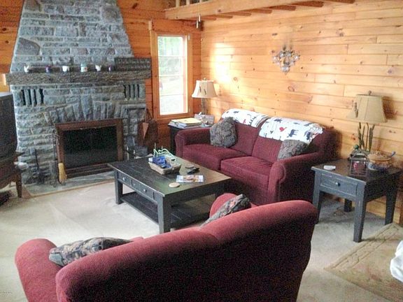 Rustic lakefront Chalet on level lot facing the setting sun! It is a 3/1.5 w/ massive bluestone fireplace, chestnut railings, vaulted ceilings & knotty pine walls. It comes furnished & in excellent condition.