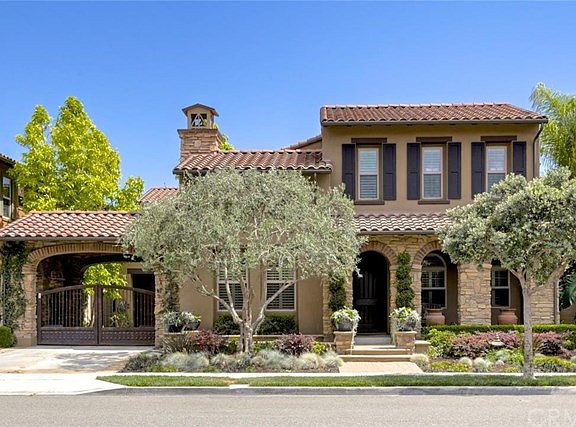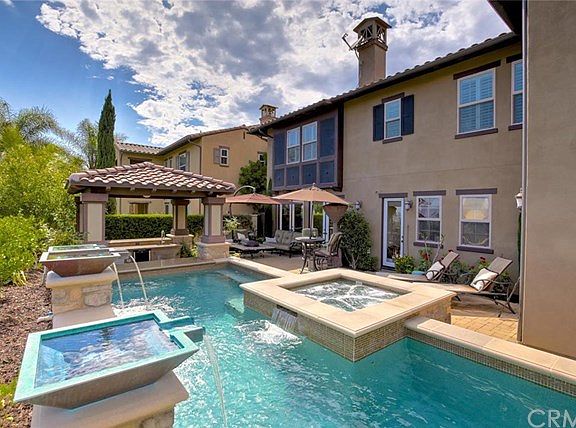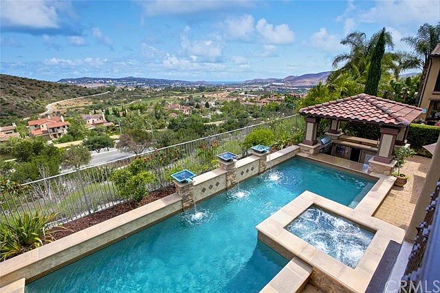 Relish in valley ocean views from a custom-caliber Talega home. Brilliantly blending the warmth of a New England estate with the grace of a Mediterranean villa, the residence boasts custom stone, granite, marble and hardwood surfaces, plantation shutters, a formal living room with 2-story ceilings, traditional fireplaces with white wood mantels, a formal dining room with French doors at both ends, and a serene color palette. Unique living spaces include a library, large stair landing, a crafts room and study alcove. A great room and kitchen area feature a built-in media center, surround sound, French doors to the backyard, a nook with built-in cabinetry, large island with bar seating, granite countertops, and professional-grade built-in Thermador and Bosch appliances. An upper hall with Juliet balcony leads to 4 bedrooms and 4.5 baths, including a fabulous owners suite with a sitting area, 2 walk-in closets, a soaking tub, and shower. A true entertainers yard hosts a motorcourt with gated porte cochere, loggia, view balcony and private yard with a luxurious saltwater pool and spa, fully outfitted lanai, and built-in Lynx BBQ island with bar seating. Further refinements include a water softener, electrostatic filter and 12.88 kw, 46 panel solar systems.