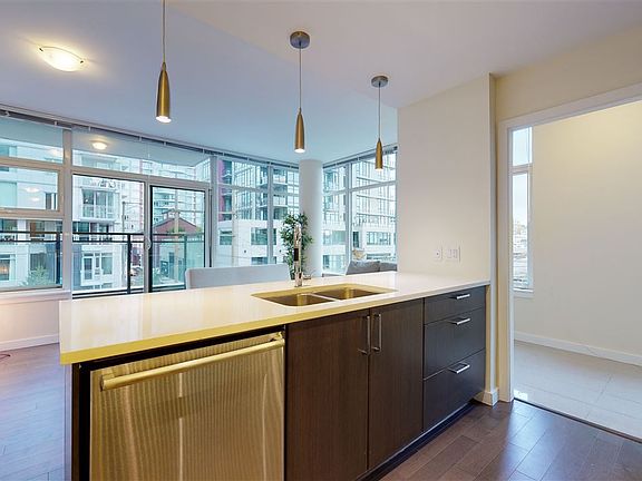 Enjoy Exquisite Urban Living with all the Amenities! This 2 Bedroom, 2 Bath Corner Unit offers a Bright and Spacious Floor Plan with Wall to Wall Windows. A large In-Suite Storage room, Den and Balcony with City/North Shore Views Complete the Picture. Features include a Gourmet Kitchen, with high end Stainless Steel Appliances and Quartz Counter-Tops. Strata fees include Heat, A/C, Water & Natural Gas. Complex Amenities are what make the real difference! A Rooftop Terrace, Exercise Room, Outdoor Pool and Hot Tub, Yoga and Pilates Studio, Lounge and Children's Playground. "The One" also Provides Underground Parking and Bike Storage. Pets are Welcome and you could not ask for a more Central Location! Just Steps from the Seawall, Science World, Restaurants, Breweries and Shops!