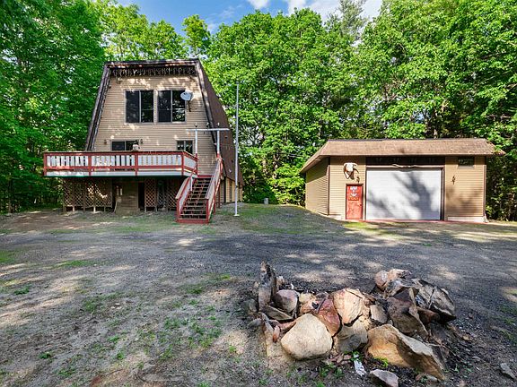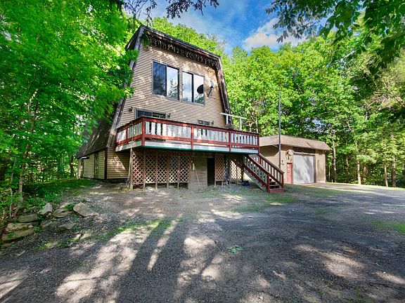 Looking for privacy? Secluded by natural tree cover is this 3 bedroom, 2.5 bath, custom, timber archetectured home perched atop the 1.3 acre lot. The interior resembles a ski lodge with an open concept, 22' vaulted ceilings, tongue and groove pine walls, Douglas Fir exposed beams and new 7" wide hickory floors. A window wall lets in natural light for passive solar heat. The home was designed with sustainability and cost efficiency in mind with Geothermal heat and a 34000kw standalone generator. Add solar panels and you're truly "off the grid!" An oversized garage with 13' bay has plenty of storage for vehicles or a side hustle. The septic system can support 5 bedrooms making an in-law addition over the garage a possibility. In addition to the driveway, there is a private road providing alternate access to the property. Make arrangements to see 38 Wells Village today!