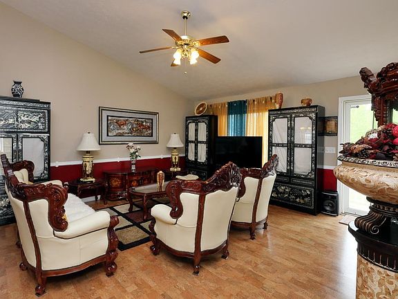 PERFECTION PLUS awaits you in this immaculate rancher over full finished walk-out basement with access to side yard and views. Flexible open floor plan allows easy family living. Beautiful prefinished luxury laminate floors add warmth and an inviting, welcoming atmosphere. Kitchen features marble counter tops & floor, wood cabinets, breakfast bar and lots of storage. Finished lower level boasts an oversized family/game/tv room that can serve as the perfect man cave, or great area for family get togethers and teenagers haven! The office/multiplex space with its separate entrance could double as an in-law suite or an in-home business. 4th BR does not have window. 2 closets in bsmt. Finished garage plus detached garage/workshop with electricity and concrete floor is ideal for the handyman or antique car enthusiast. Relax and unwind in screened gazebo strategically placed for convenience and views. Nice yard for kids and pets. Convenient rural county setting only minutes from town. Pull down attic stairs. 2 radon detectors with ADT. Meticulously maintained!