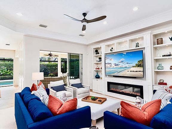 Experience life in one of Naples' most pleasant neighborhoods just steps to the beach! Southern Sunset is a newly renovated and designer decorated coastal style home with all of the features and amenities you're searching for. Enter from the circular drive into an open living room with views out to the southern exposure lanai, heated pool and hot tub. A new picture window screen enclosure showcases lush tropical landscaping around the private pool area while keeping bugs out so you can enjoy dining and lounging on the covered lanai. Outside the lanai is a small deck area with a gas grill and fire pit with comfortable chairs. Inside, a split floor plan places the master bedroom on the west side of the house with a king size bed, flat screen TV and large en suite bath. Three guest bedrooms are located on the east side of the house. The newly updated open kitchen with breakfast bar offers views out to the pool and dining room with pocketing sliders. The living room and adjacent sitting area with writing desk offer space for everyone to lounge inside and watch the large television, also visible from the kitchen. Comfort, privacy, style, and a fantastic location - truly an ideal rental!