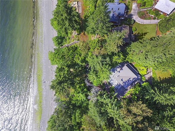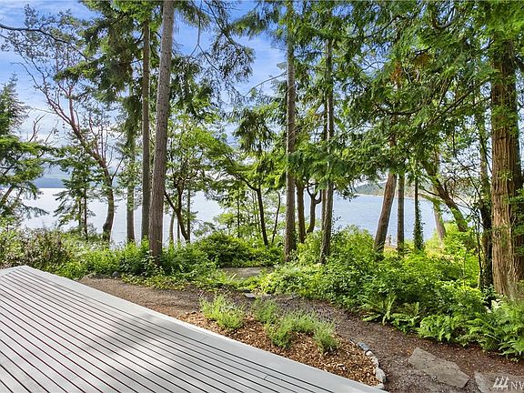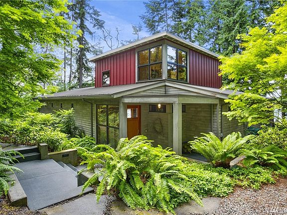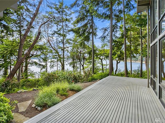 Perched on the shore of Discovery Bay sits a home perfectly situated for its Evergreen environment. The core of this 2000 sf house is the central living space, a two-story cube that sits at a 45 degree angle to the site property lines w/ stairway to water's edge. The unique geometry of the layout creates multiple views of the mountains and bay. Views from the interior living spaces and generous exterior deck are framed by the one-story wings that extend on either side. Design by RHO Architects.