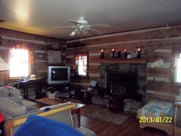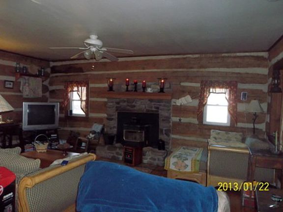 Two story with original log walls dating back to 1875. 3 bedrooms, 2 full baths, kitchen with stove, refrigerator & dishwasher,living room with wood floors, stone fireplace with pellet stove insert & log walls, dining room with wood floors and log walls, 3rd floor finished attic and much more on over 2+ acres with meandering Hawksbill Creek. Has 2 bedroom septic. Flood Zone X