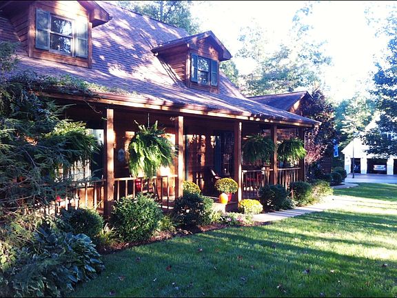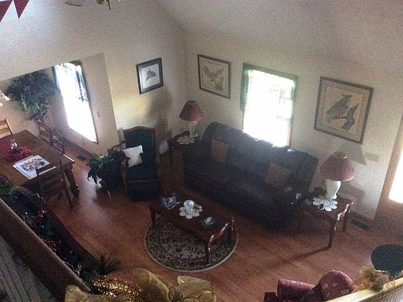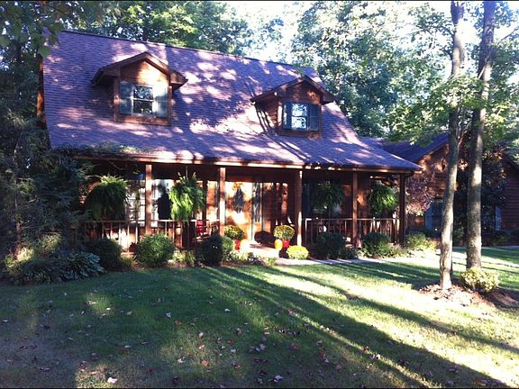 Country living at Eagle Trace Golf Course. Cedar sided cape cod with rocking chair front porch. Sit on the rear screened porch and watch the wildlife. Hot tub with large decking. Scenic wooded level 1.53 acre lot. Hardwood & laminate flooring, Gas fp. 3br, 2.5 bath. 3 car garage. Move in ready.Also has large storage building and jungle gym. All appliances kitchen and laundry room stay as well as large wood entertainment cabinet in Great Room.