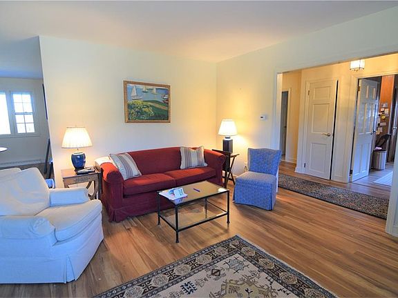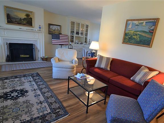 In a perfect location between Newport town and the beaches with an easy walk to the Cliffwalk, this newly refurbished duplex offers new floors throughout and newly painted throughout in 2019, a wood-burning FP in the spacious and light filled Living room and a built-in hutch in the dining area. The kitchen has new floors and updated cabinetry, and a lovely breakfast nook. Off of the kitchen is a laundry room/mudroom and covered deck overlooking an expansive lawn. The master bedroom has two large double closets, and master bath with a tub/shower. The second bedroom, is wood paneled and could also double as a den or office. There are ceiling fans in each of the bedrooms. A full hall bath with stall shower. One attached garage space and enormous basement for storage. Driveway parking as well.