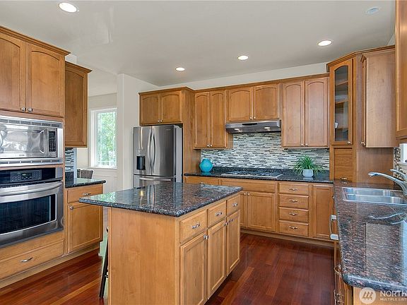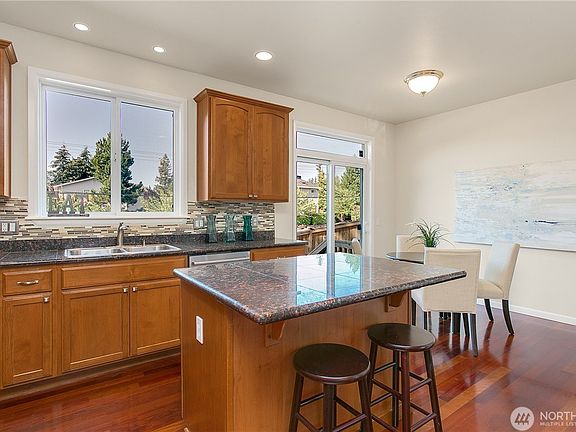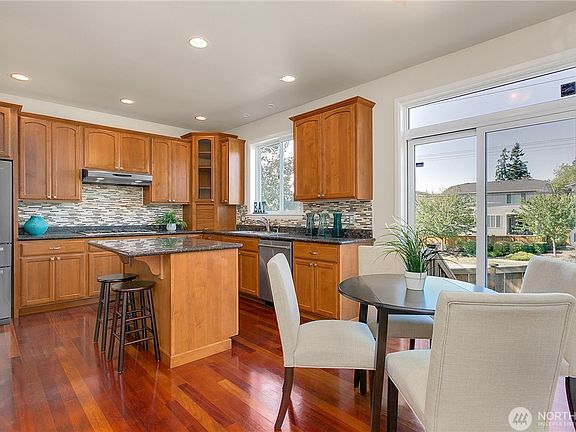 Modern 3-bedroom, 3.5-bath home, move-in ready! Featuring a circular floor plan, the living room flows seamlessly into the dining area and kitchen with a cozy nook. The kitchen offers ample counter space, stainless steel appliances, and direct access to the back patio. Upstairs, the primary suite boasts a private deck, a luxurious 5-piece en suite, and a walk-in closet. Two additional bedrooms and a full bath complete the upper level. HW floors through out. The basement includes a laundry area, a versatile bonus/media room (potential 4th bedroom), and a full bath. Attached 2-car garage. Conveniently located near shopping, schools, I-405, Hwy 169, Boeing, and Microsoft.