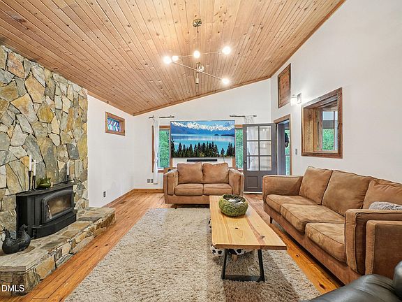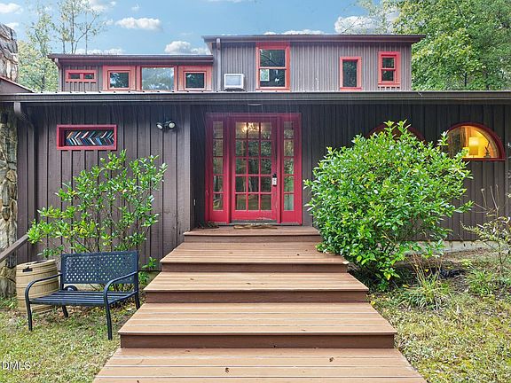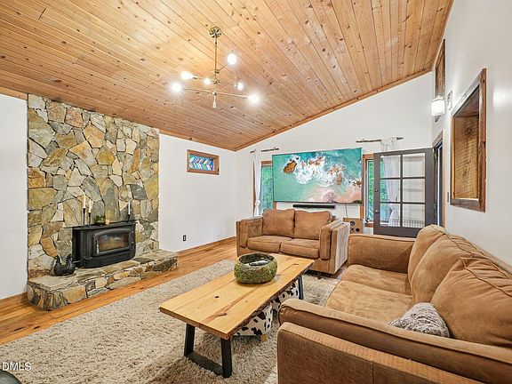 Welcome to this inviting 1.5-story home featuring 3 spacious bedrooms and 2 full bathrooms. Step inside to a large entry foyer that opens into a cozy living room with a wood stove insert—perfect for chilly evenings. The first floor offers two comfortable bedrooms and a full bath, while the private master suite occupies the entire second level, providing a peaceful retreat. Warm pine and wood accents flow throughout the home, creating a rustic, welcoming feel. The heart of the home is the expansive kitchen, complete with a huge island ideal for meal prep, casual dining, or entertaining. Enjoy the charm of a second wood stove in the dining area and relax year-round in the bright enclosed sunroom overlooking the outdoors. Step outside to a large deck—great for gatherings or quiet mornings—and take advantage of the external storage building for all your tools and gear. All of this in a prime location with quick access to Hwy 64 and 15-501, just minutes from Jordan Lake's recreation and beauty. A perfect blend of comfort, character, and convenience—come see it today!