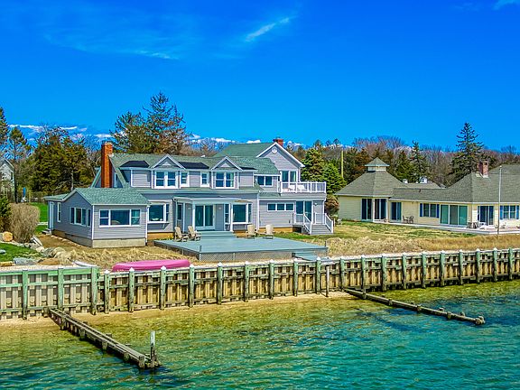 Spectacular renovated bayfront home at 380 Midway Road, Southold, embracing the prevailing southwesterly breezes and sweeping views over the Peconic Bay to the South Fork. The expansive waterside deck is destined for entertaining and cocktails at sunset while the beachfront bulkhead is a great spot to enjoy coffee in the morning. The impressive home spans two wings, each with bedrooms and entertaining spaces. The center of the homes features an updated kitchen, formal dining, living room with fireplace, and sunroom, all with magnificent waterviews. The second-floor guest wing includes a guest ensuite with chic finishings in the bath that include a bayview jacuzzi. Two additional bedrooms and full updated guest bath complete the upstairs. On the east side of the house, a private master wing begins with a separate entrance, living room with fireplace, and wet bar. The second floor of the east wing includes a master suite with a private waterview terrace and updated full bath. The home enjoys natural light throughout and each room takes in the views. This stunning, waterfront home is North Fork living at its best.