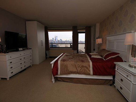 This unique layout in fabulous Troy Towers has large living space, sunny dining alcove with floor-to-ceiling windows, and huge terrace facing the magnificent New York City skyline; perfect for entertaining! Roomy open kitchen with stainless appliances including Sub-Zero refrigerator. King-size master suite has giant picture window, direct terrace access and big walk-in closet. Spacious, private second bedroom is at opposite end and third bedroom is perfect for home office, guests, or nursery. New wood laminate floors. Rare opportunity! Rent: $3,000/mo. plus $200 for all utilities and basic cable= $3,200. optional parking +$125/mo. (Utilities include electric, heat, water, central AC, use of seasonal swimming pool! Basic cable TV includes 2 converter boxes and service is upgradable. 1 1/2 mo. security, $35 credit check fee, $300 + $75 per person coop application fee, $500 move-in fee/move-out fee. Board interview required. Optional gym membership $240/year. Low broker fee.